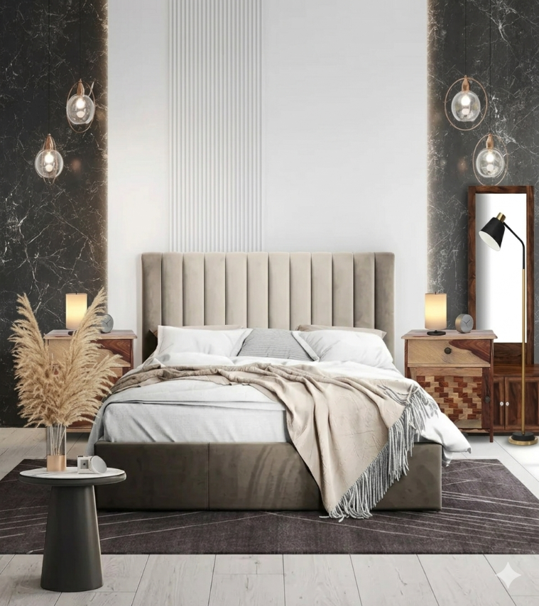 Fluted Upholstered Fabric Queen Size Design Bed Without Storage (sheesham Wood)