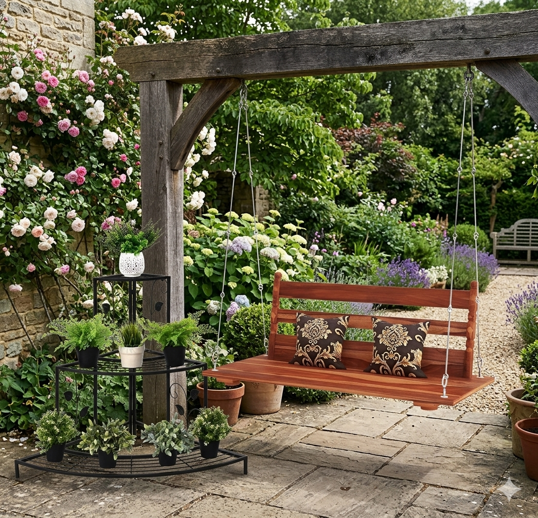 3 Seater Swing Brass Coated Wooden Jhula for Indoor Outdoor & Balcony | House Swings for Adults (52 Inches)