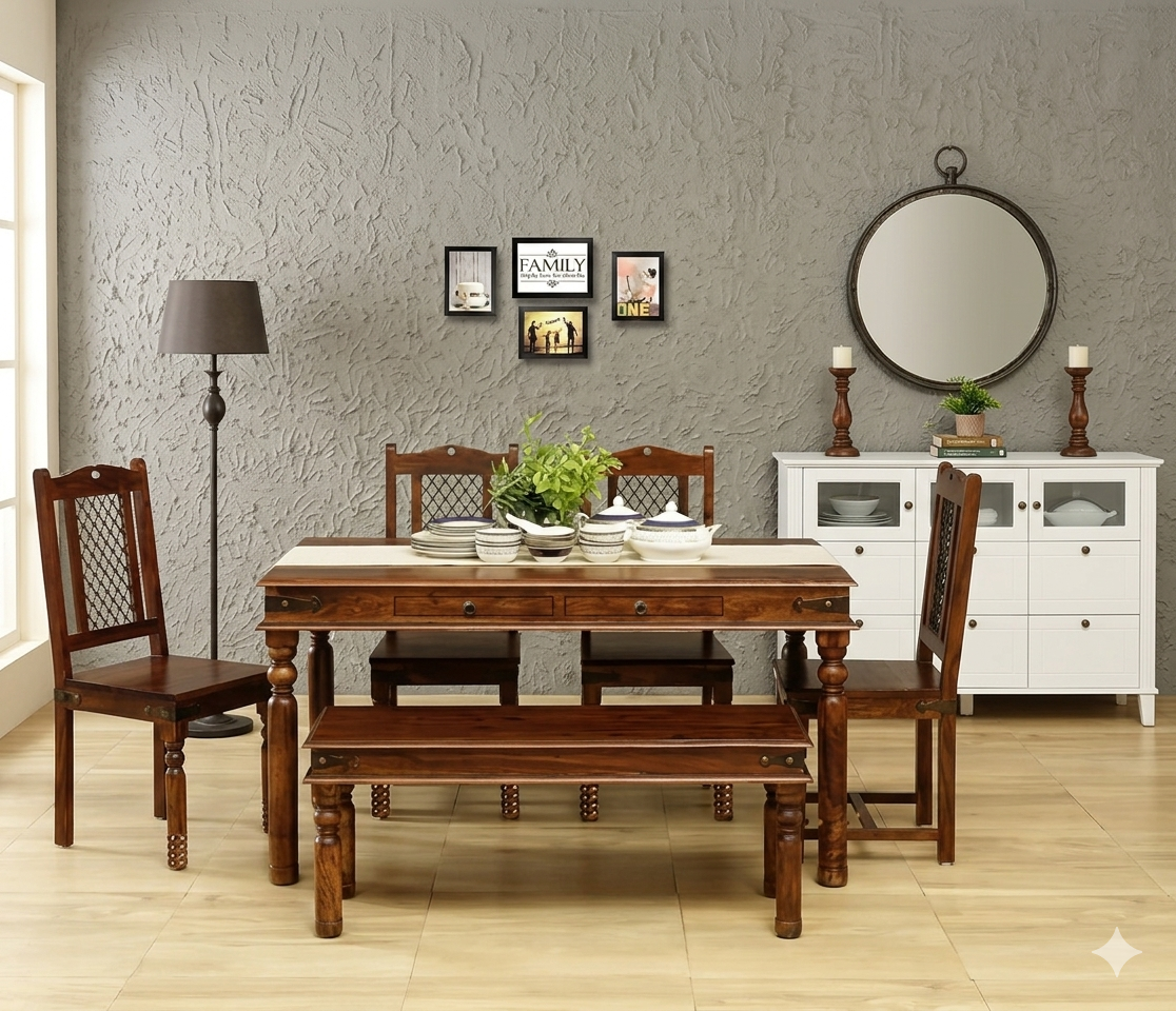 Noetic Solid Sheesham Wood 6 Seater Dining Table with Chairs (Rustic Teak Finish)