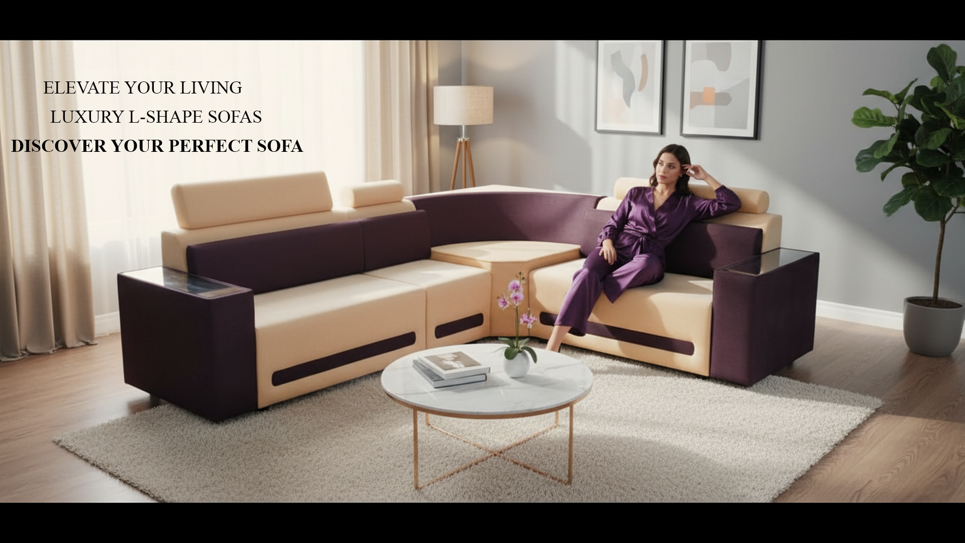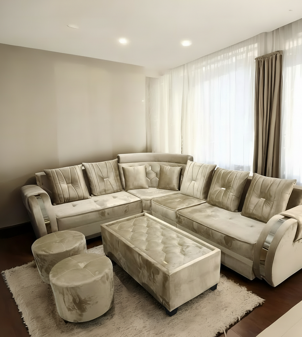 L-Shaped Sectional 6-Seater Sofa with Coffee Table & 2 Ottoman Padded Armrest Perfect Velvet Fabric Corner Sofa for Guests Living Room, Drawing Room, Office & Lounge (Grey)