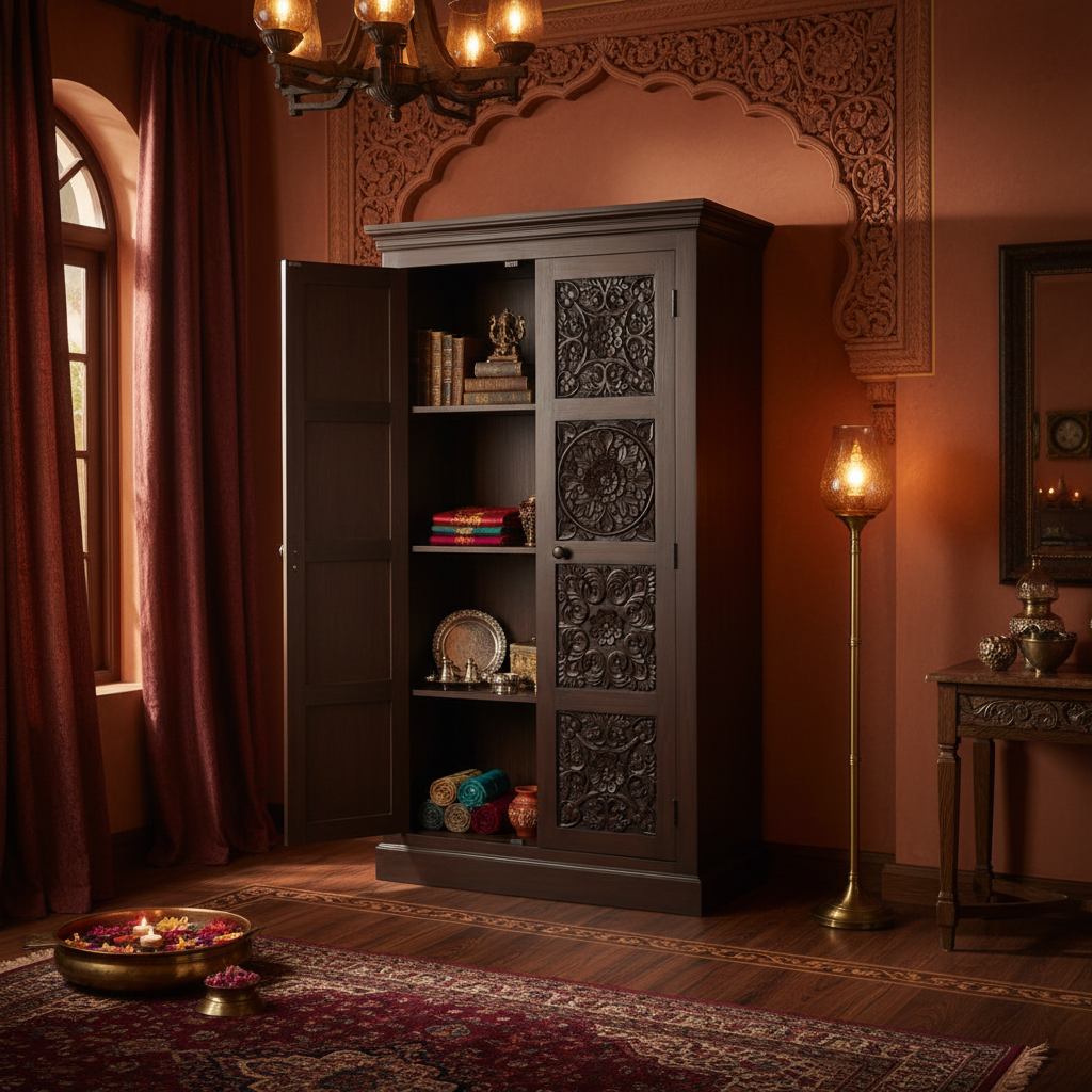Bianco Carved Mango Wood 2‑Door Wardrobe – Aged White Storage Almirah