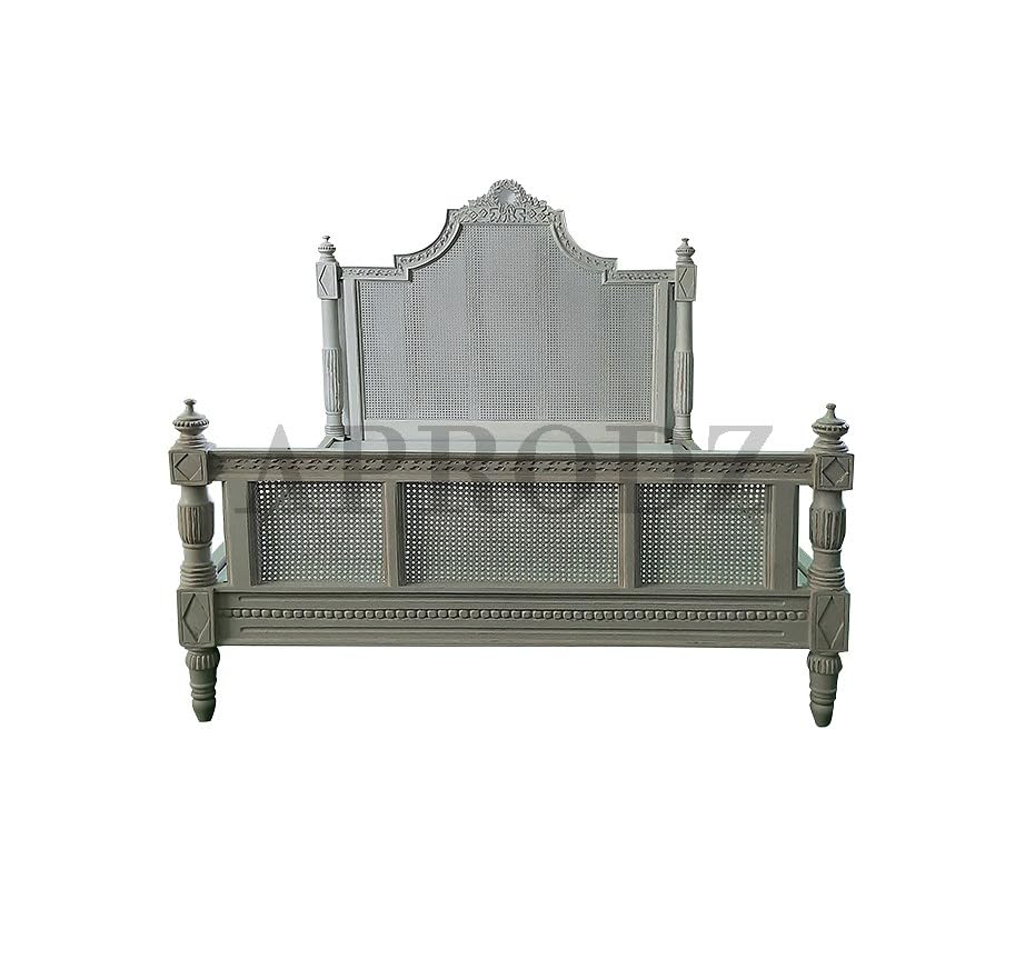 Hand-Carved French Cane Bed - Exquisite Artisan Design - Premium Mango Wood in Light Grey