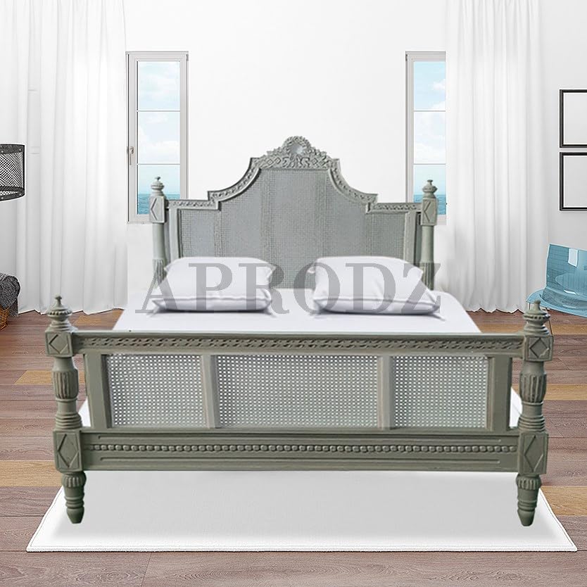 Indulge in the luxury of handcrafted elegance with the Aprodz Hand-Carved French Cane Bed. Meticulously crafted from premium mango wood and finished in a sophisticated light grey, this bed showcases the pinnacle of artisan design. The intricate hand-carved details and French cane work elevate this piece from mere furniture to a statement of timeless artistry. Every element of the Aprodz French Cane Bed speaks to exceptional craftsmanship and attention to detail. The durable mango wood construction ensures lasting stability, while the light grey finish adds a touch of contemporary elegance, making it a perfect fit for any bedroom decor. The unique hand-carved patterns and cane inserts create a harmonious blend of classic and modern styles.