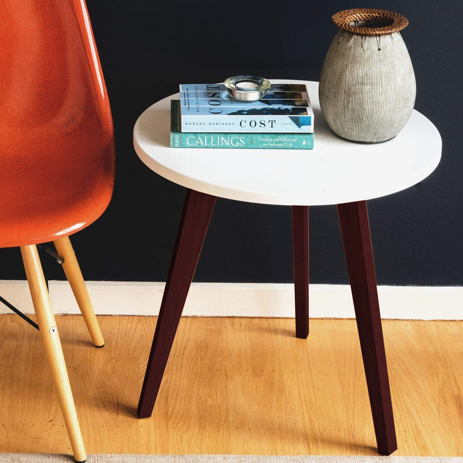 Aprodz. Mid-Century Modern End Table: Perfect Bedside Nightstand or Living Room Side/Accent Table - White Round Tabletop & 3 Acacia Legs