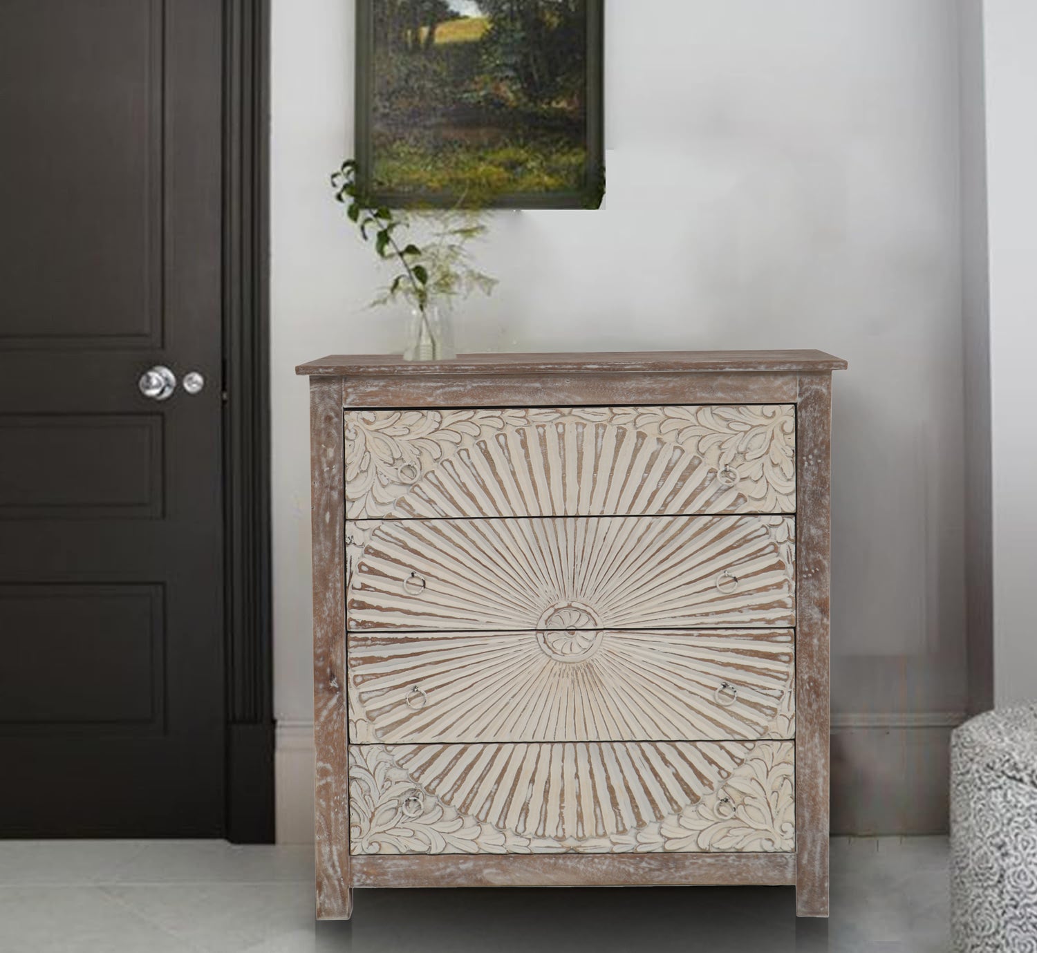 Hand-Carved Solid Mango Wood Chest of Drawers – Rustic Wooden Storage Cabinet with 4 Spacious Drawers for Bedroom, Living Room, or Hallway