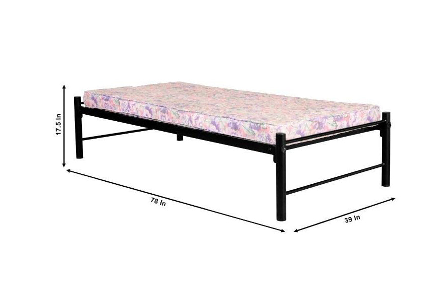 - Product Dimension:- Length (78 IN), Depth (39 IN), Height (17.5 IN) || Recommended mattress size: Single Size: 78" X 36" || Frame material:- Metal Colour: Black