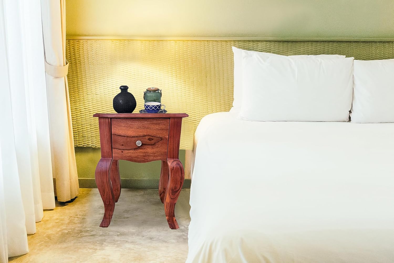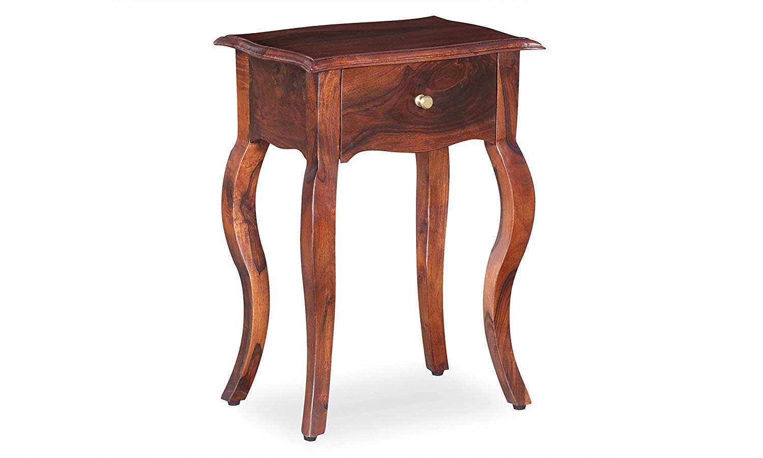 Handcrafted to perfection by skilled artisans, this shapely bedside table provides a lone drawer, crafted from sheesham wood, for hassle-free storage. French-inspired design available in rustic walnut or subtle honey finish, the Leego bedside table is sure to be the most striking feature in your bedroom. Add a dash of elegance to your bedroom with this piece