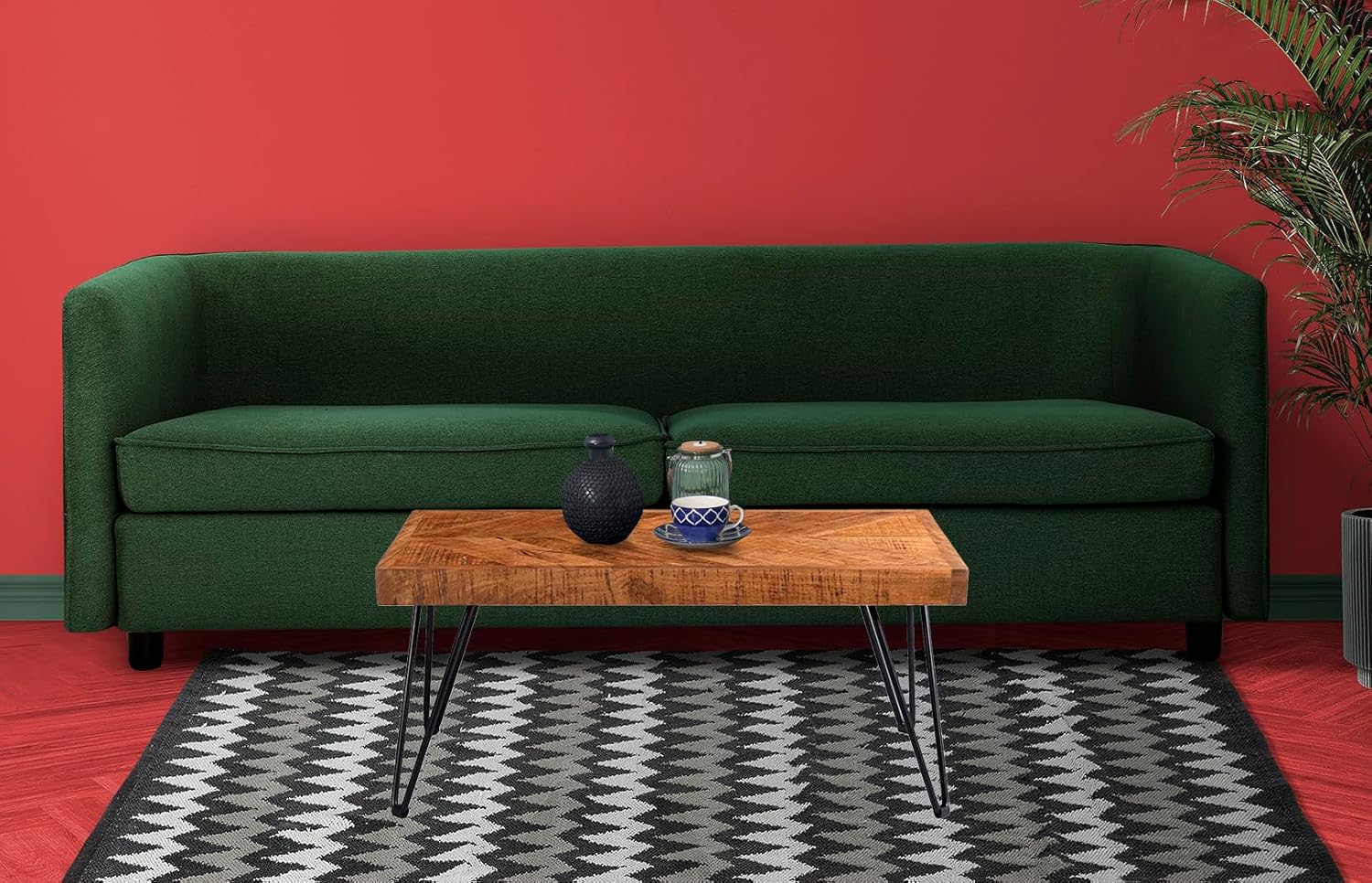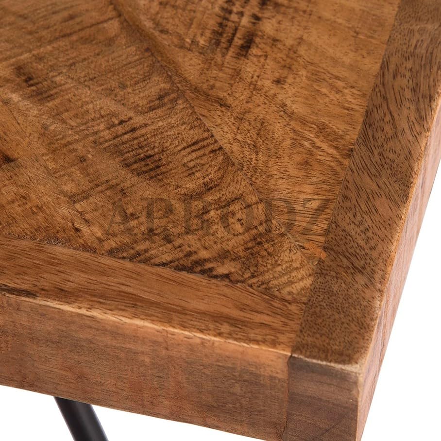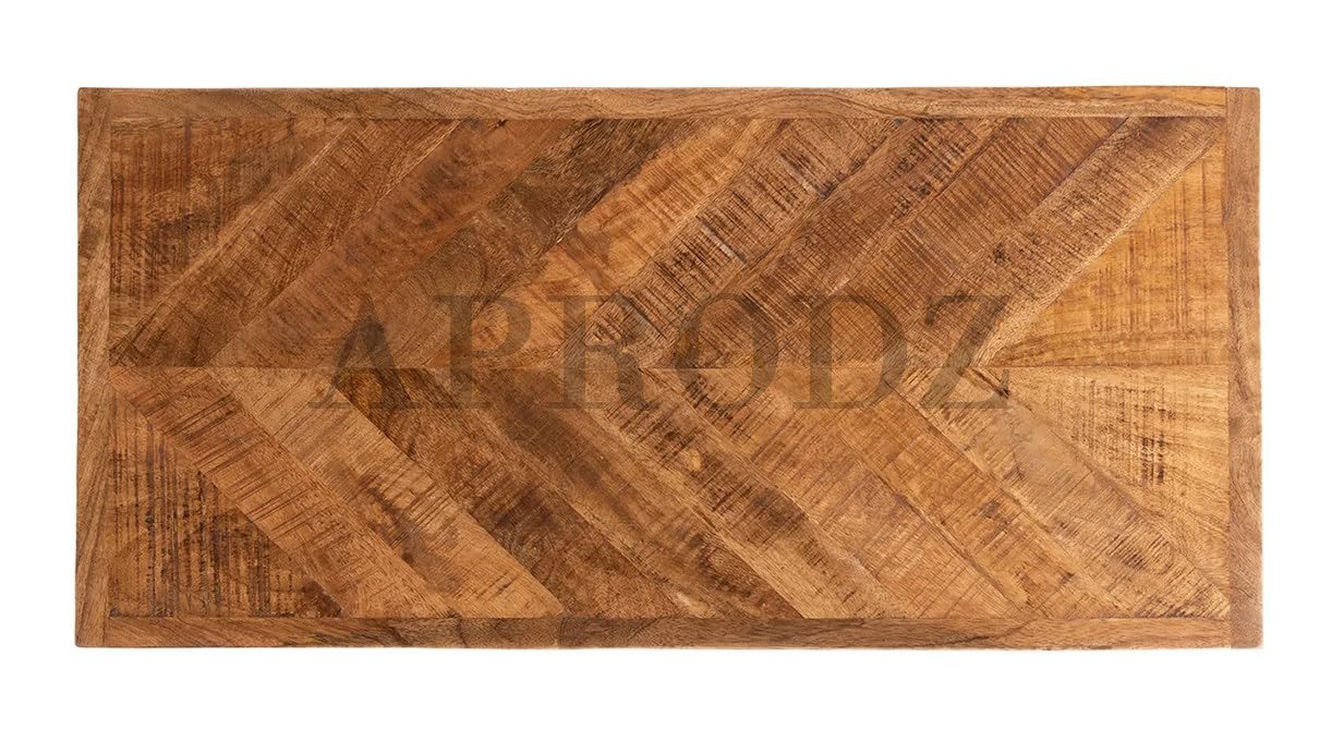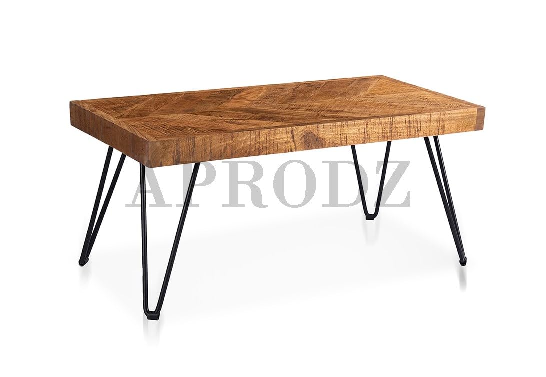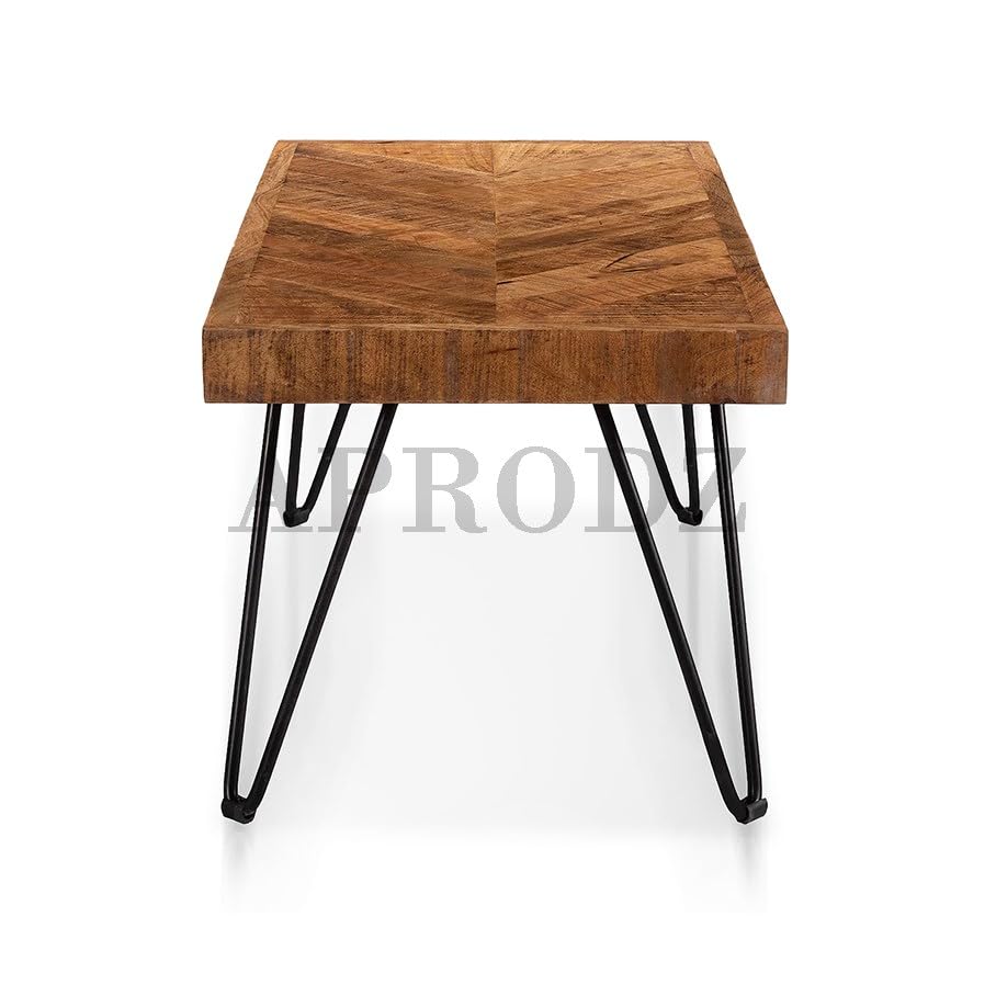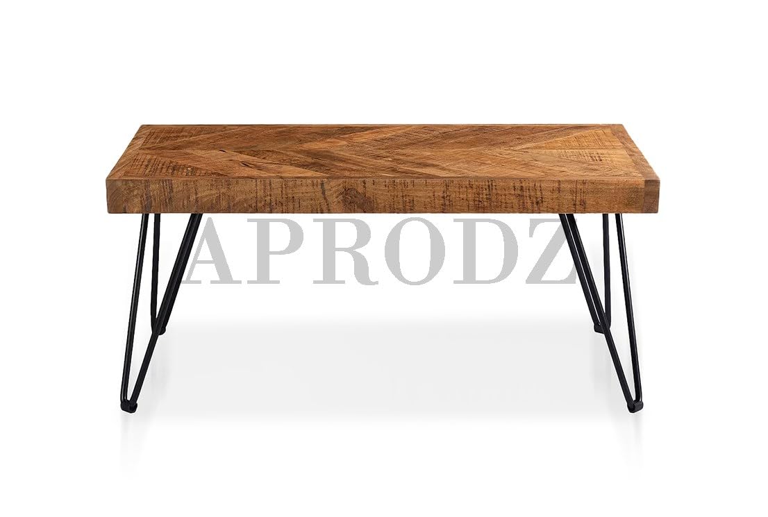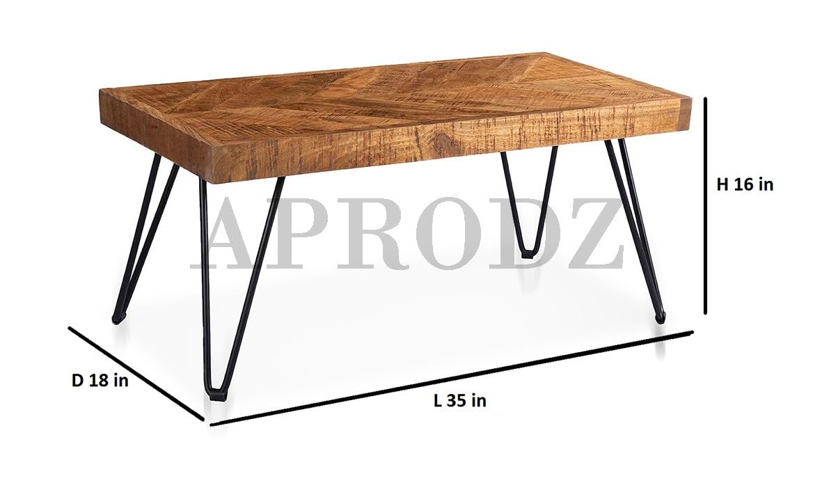 Elevate your living space with the Aprodz Parquetry Hairpin Coffee Table, a stunning blend of sleek design and elegance. This beautifully crafted center table showcases an intricate parquetry design on the tabletop, delivering a chic and minimalistic look. The hairpin legs, finished in black powder coating, provide a modern touch while enhancing the retro aesthetic of this industrial-style coffee table. With its neutral finish and herringbone pattern in solid mango wood, this versatile piece seamlessly fits into any décor. Perfect for serving tea and snacks to guests, it effortlessly transforms into a stylish cocktail table for entertaining. Upgrade your living room with this functional and eye-catching accent piece!
