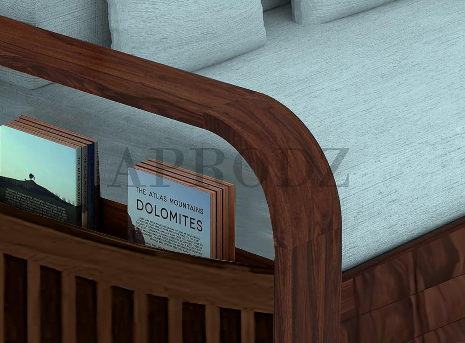 Transform your living space with this versatile Sheesham wood sofa cum bed that seamlessly combines style and functionality. Crafted from premium quality Sheesham wood in a warm honey finish, this 2-seater features an elegant geometric pattern on its front panel and gracefully curved armrests with built-in storage compartments. The comfortable turquoise upholstery adds a refreshing pop of colour while providing excellent seating comfort. This space-saving piece easily converts from a sophisticated sofa to a comfortable bed, making it perfect for both daily use and accommodating overnight guests. The robust wooden frame ensures durability, while the thoughtful design includes convenient book storage spaces integrated into the armrests. Whether placed in your living room, guest room, or study, this sofa cum bed serves as both a practical furniture piece and a striking design element. The premium upholstery is easy to maintain, and the solid wood construction promises long-lasting performance.