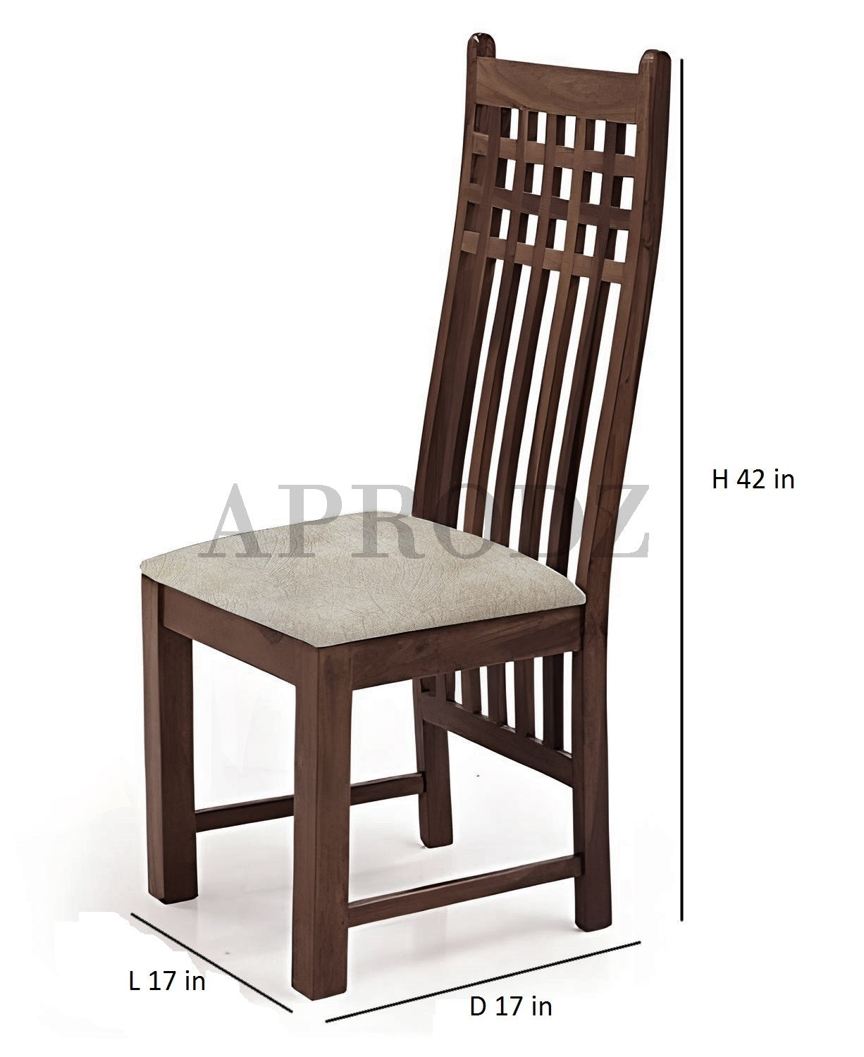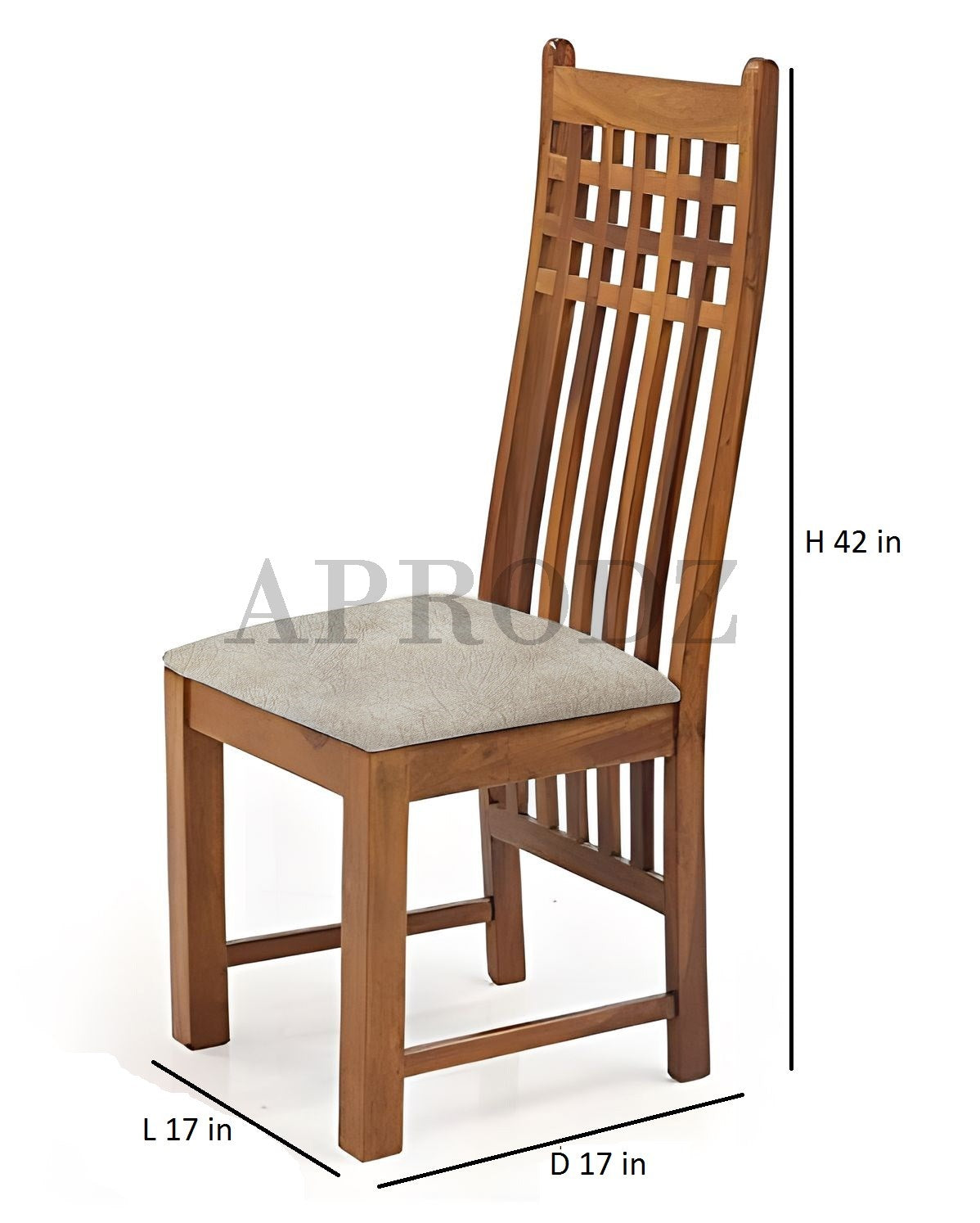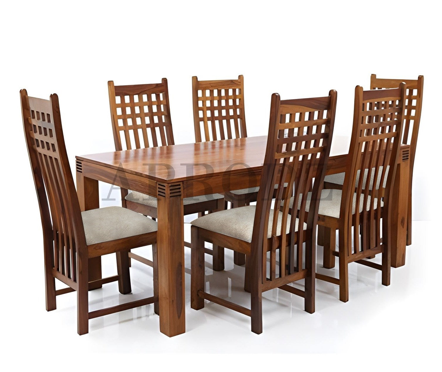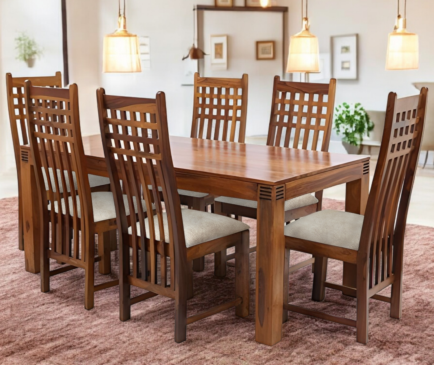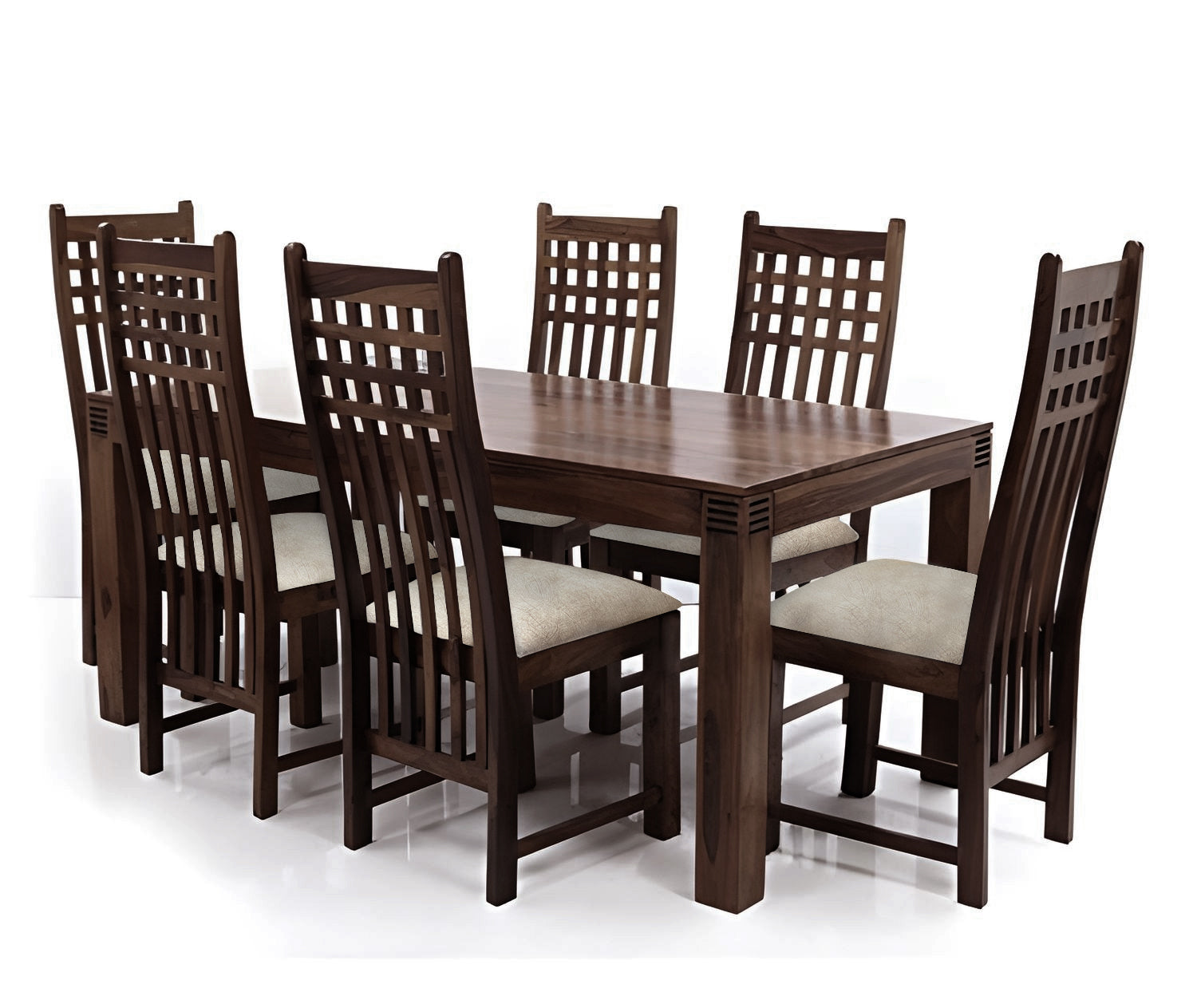 Avavia dining set fills a small space with streamlined styling. Six chairs with wooden strip work on the long back gather around the table for comfortable chatting and eating. Sleek structure of the dining table provides comfortable space for leg extension for diners. Soft-padded seats give an experience of enjoyable meal with family and friends. Wood stained to retain natural grain patterns of the Sheesham wood, the dining set is easily suitable in any interior of dining place.