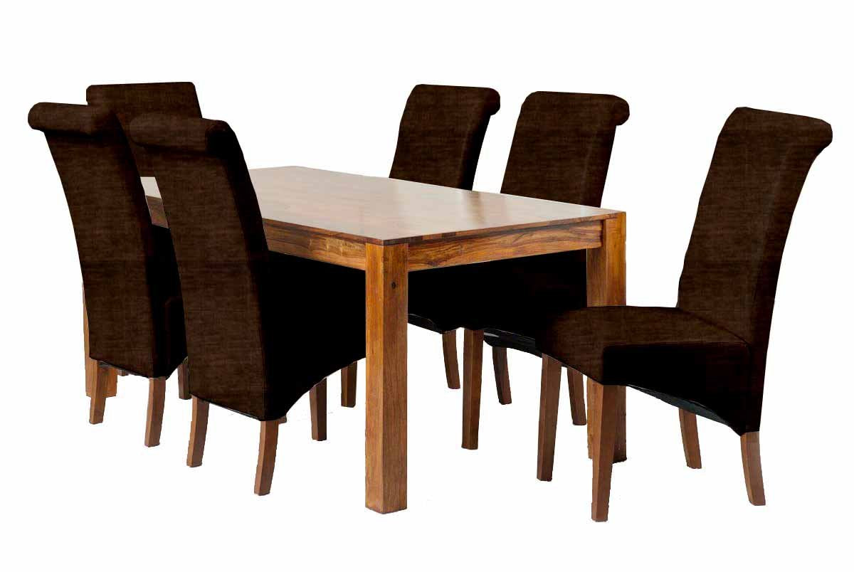 - A stunning dining set consisting of six soft,fabric upholstered dining chairs combined with a characterful solid sheesham wood table. This dining table set is a comfortable addition to any dining room.