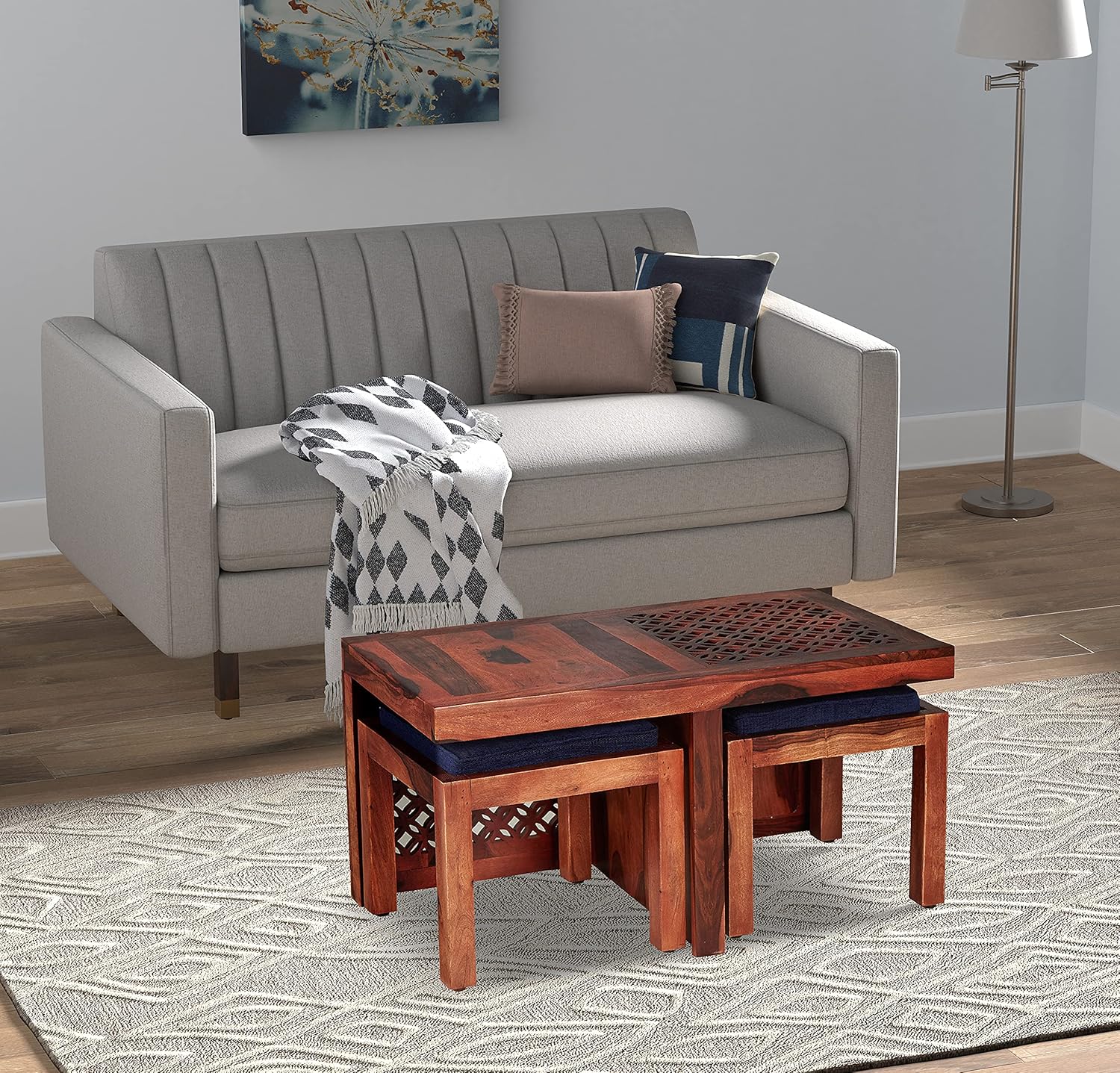 Sheesham Wood Jose Stylish Coffee Table with 2 Stools for Living Room Center Teapoy Table for Home | Brown Finish
