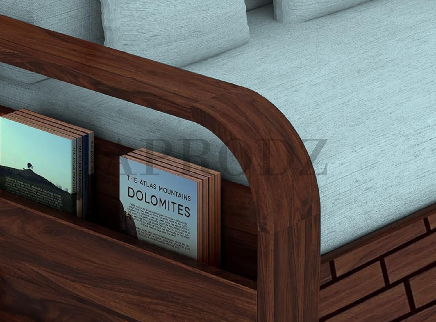 Transform your living space with this versatile Sheesham wood sofa cum bed that effortlessly combines style and functionality. Crafted from premium Sheesham wood in a warm honey finish, this 2-seater features an elegant brick-pattern design and curved armrests with built-in storage spaces perfect for books and magazines. The plush turquoise upholstery adds a refreshing pop of colour while providing exceptional comfort whether you're sitting or sleeping. The innovative design allows for quick conversion from a comfortable sofa to a spacious bed, making it ideal for compact homes or guest rooms. The solid wood construction ensures durability and stability, while the contemporary design with clean lines complements any modern décor. The thoughtfully designed backrest provides proper support, and the matching cushions enhance both comfort and aesthetic appeal. Perfect for daily use, this multipurpose furniture piece offers practical storage solutions while maintaining a sophisticated appearance in your home.